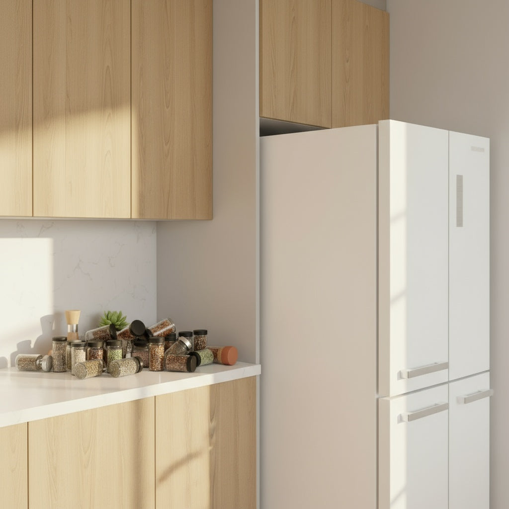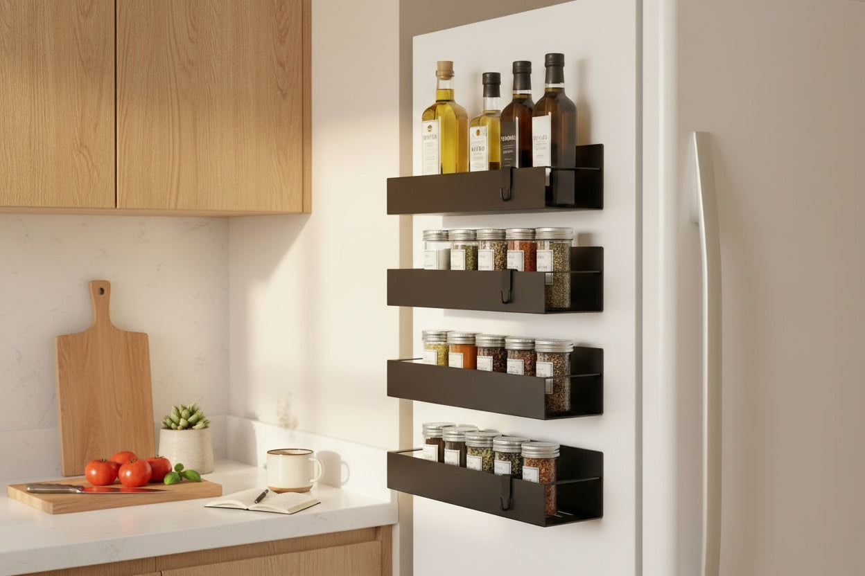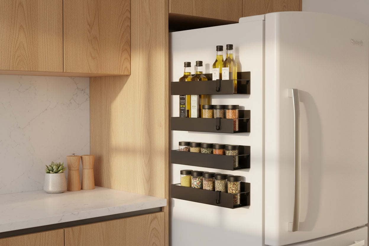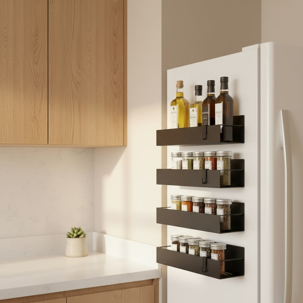 En el diseño de hogares modernos, cada centímetro cuenta. Creamos estas repisas para aprovechar el espacio vertical más olvidado: el lateral de tu nevera. Convierten un área "muerta" en almacenamiento premium al instante. Es la solución de diseño inteligente para liberar tu mesón y recuperar tu espacio de preparación.