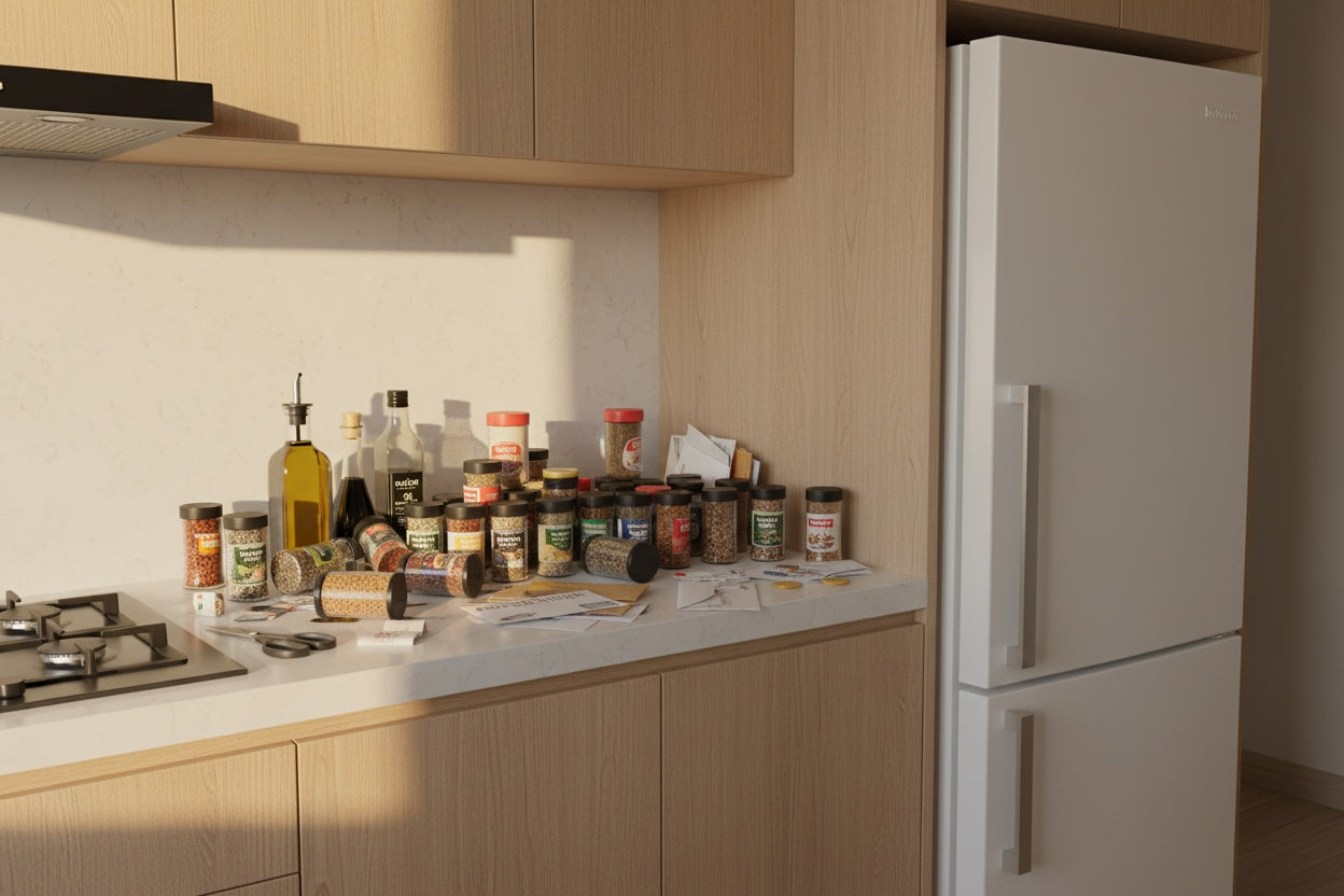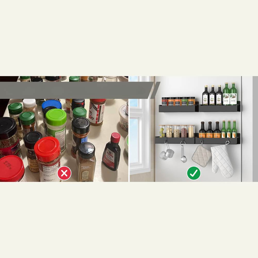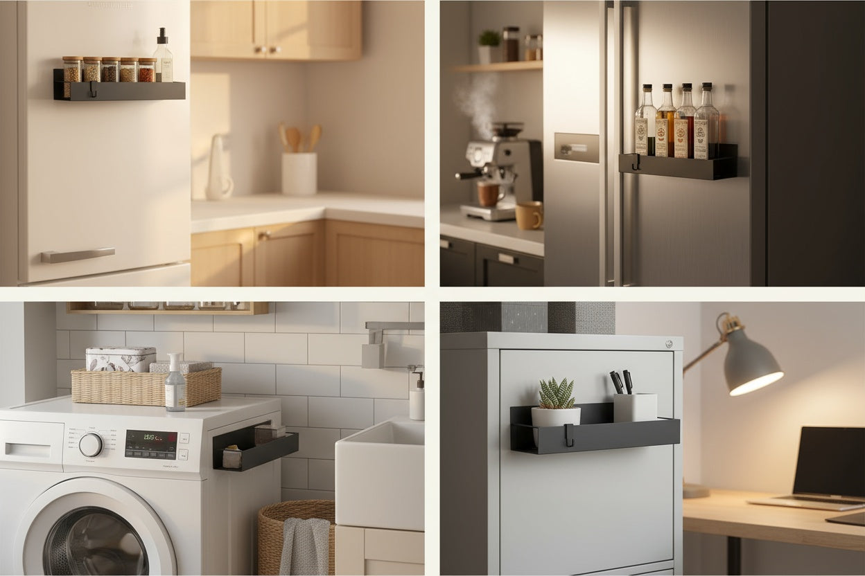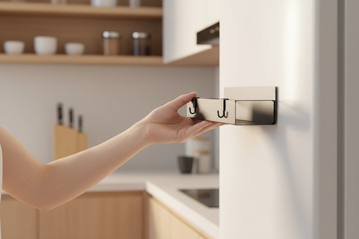 En el diseño de hogares modernos, cada centímetro cuenta. Creamos estas repisas para aprovechar el espacio vertical más olvidado: el lateral de tu nevera. Convierten un área "muerta" en almacenamiento premium al instante. Es la solución de diseño inteligente para liberar tu mesón y recuperar tu espacio de preparación.