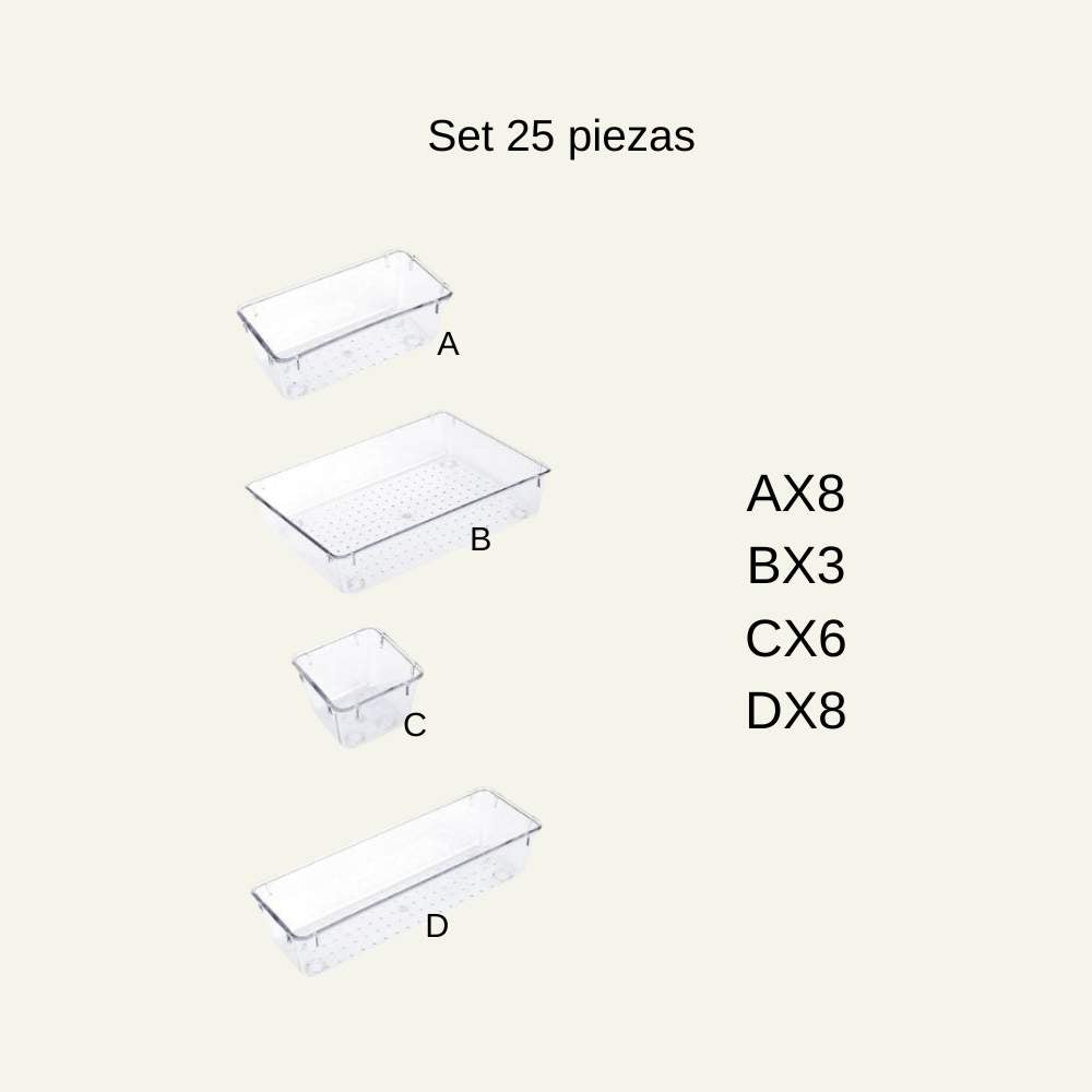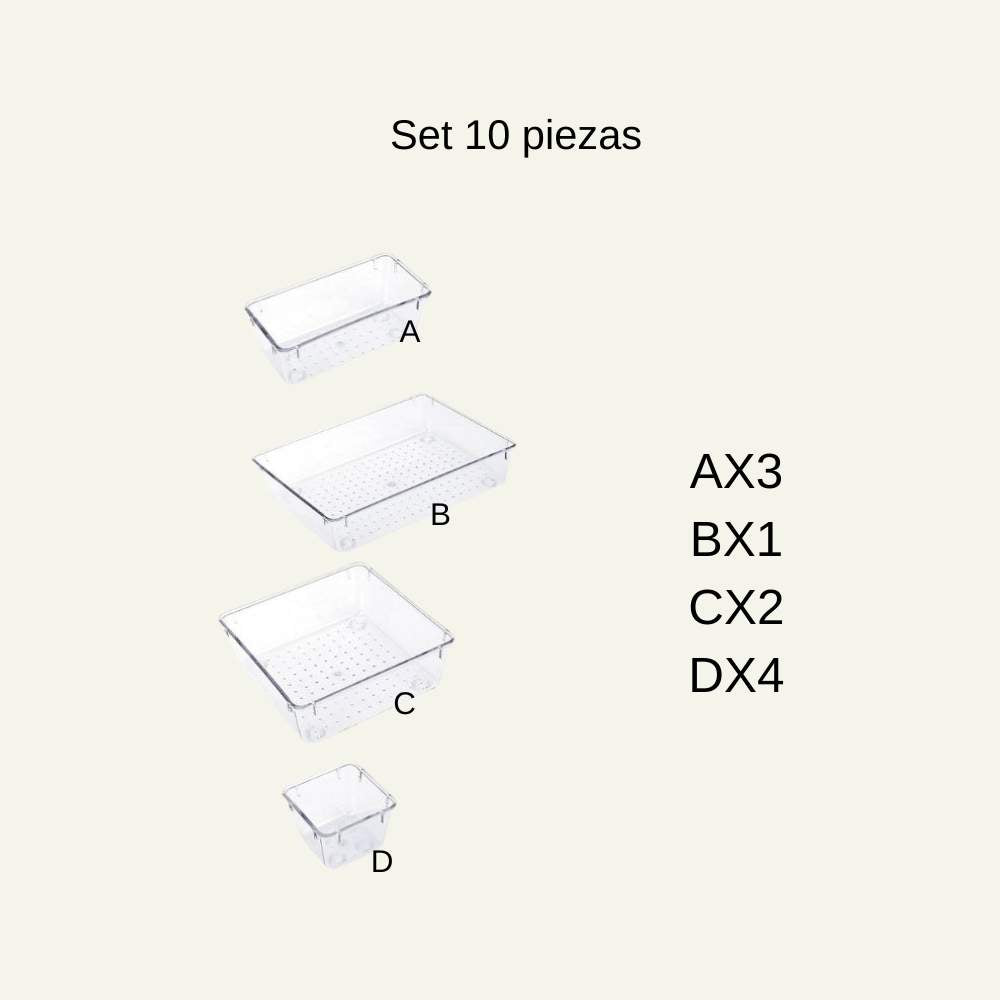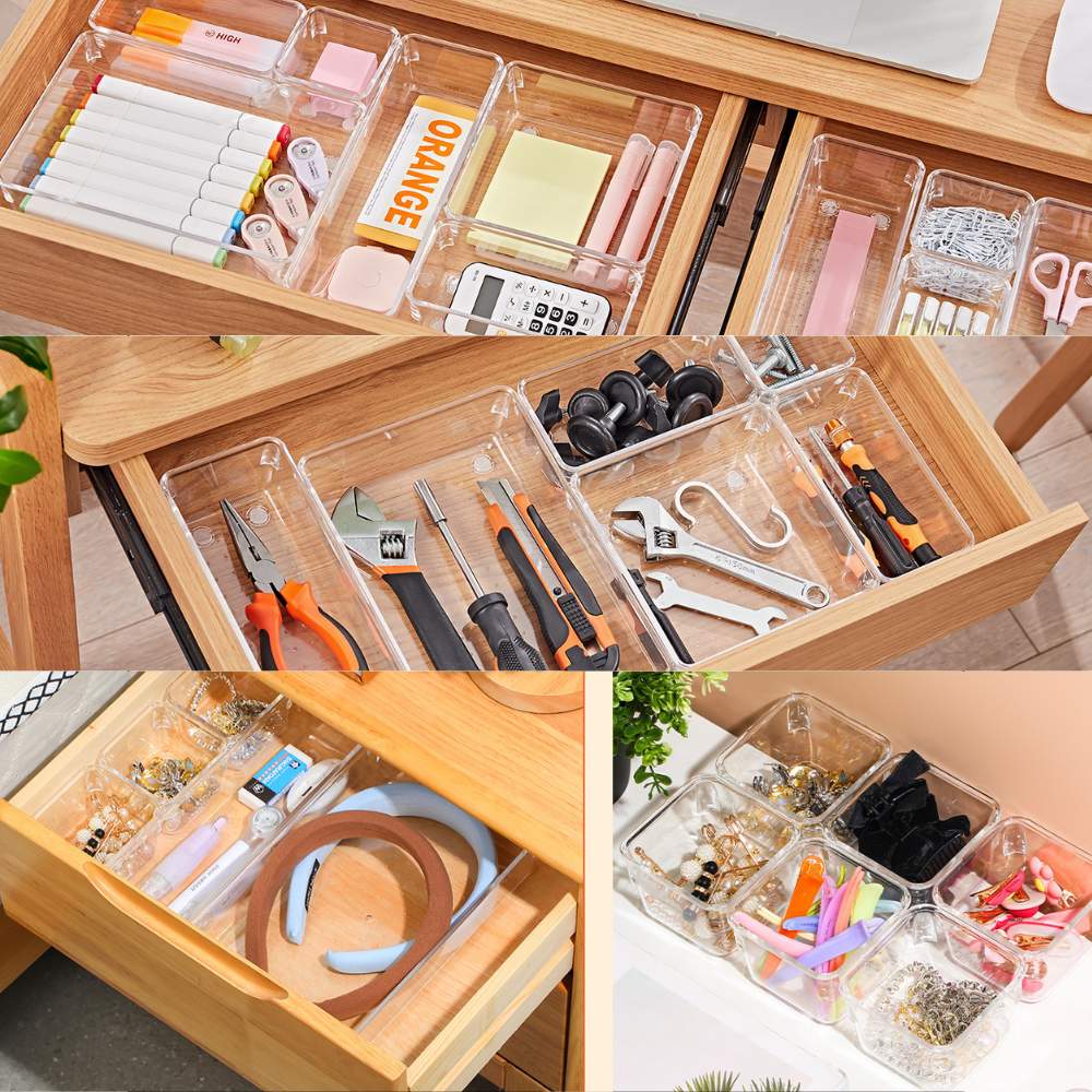 Por esta razón, el Set Organizadores Para Cajones de Escritorio es la solución ideal para tus necesidades de almacenamiento. Con su diseño transparente y combinaciones de diferentes tamaños, este organizador te permite mantener tus cajones organizados y optimizar el espacio disponible, mejorando la eficiencia en tu hogar.