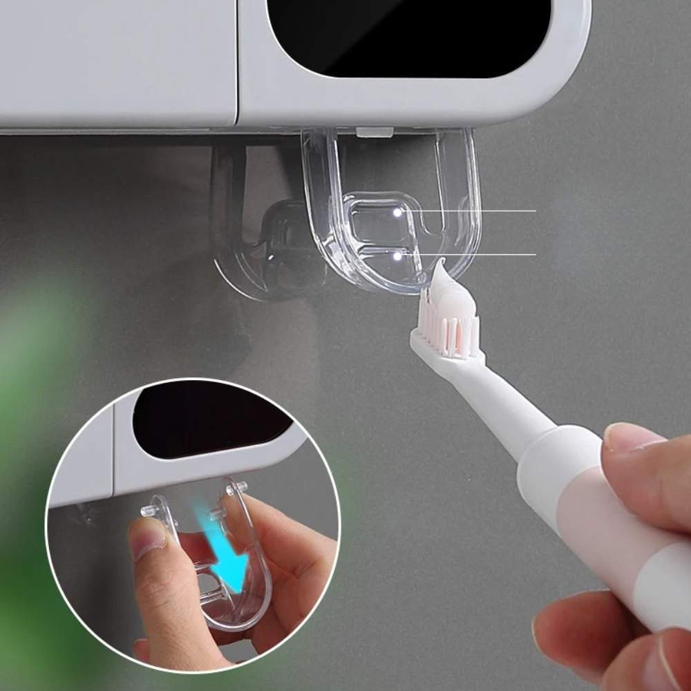 Este rack multifuncional une un dispensador automático de pasta dental con un esterilizador UV integrado, manteniendo tus cepillos siempre secos, limpios y listos. Todo sin taladrar y con estética minimalista.