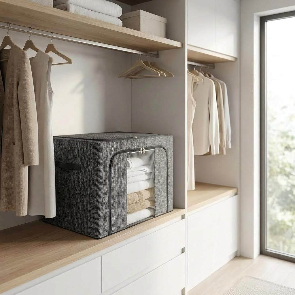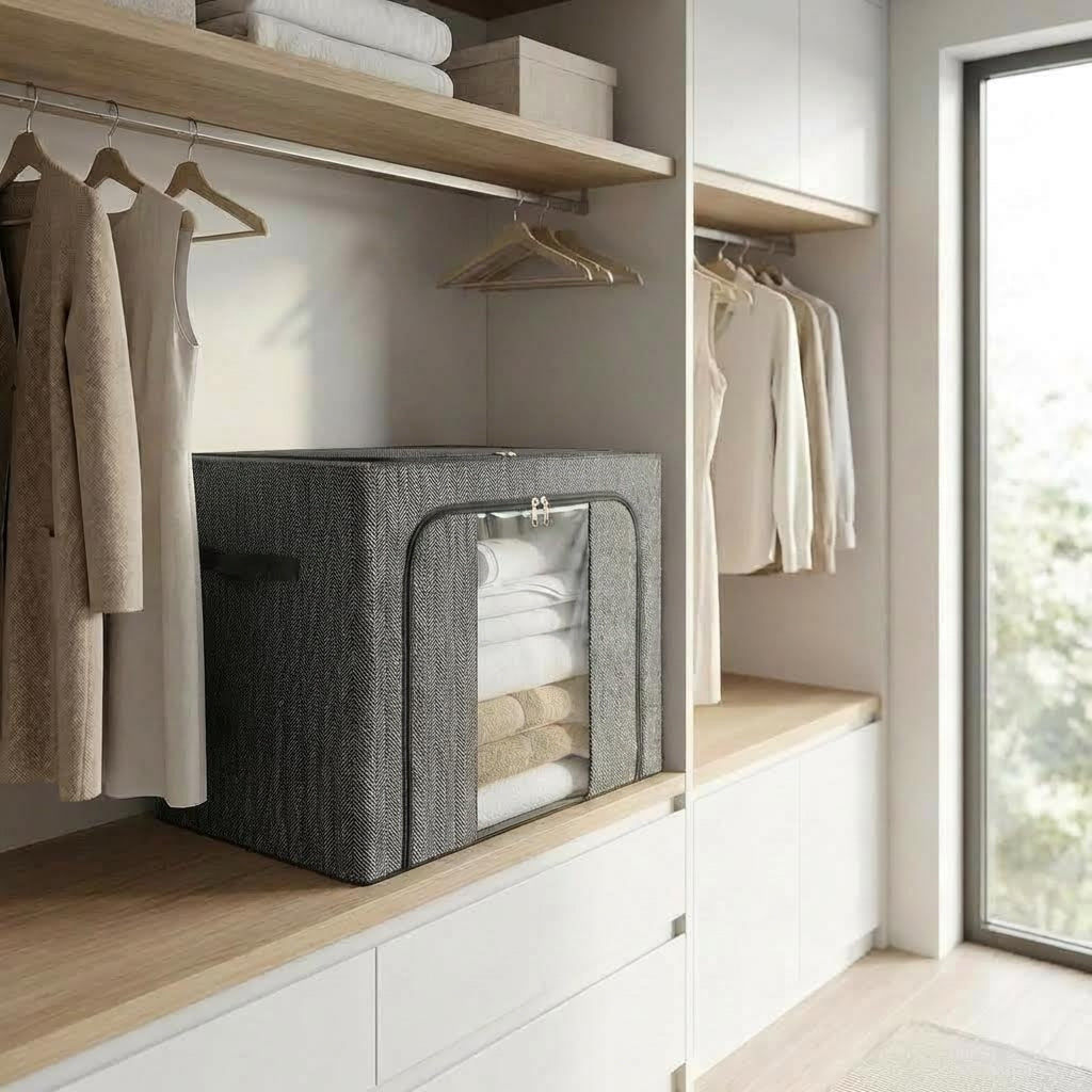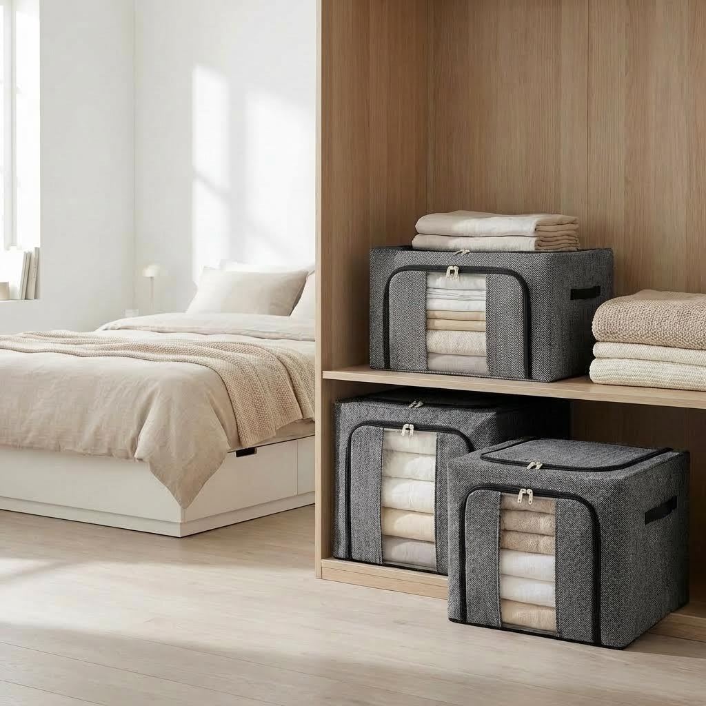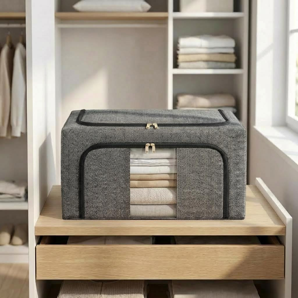 • Estructura Rígida y Duradera: A diferencia de las cajas de tela comunes, este organizador está reforzado con un marco de metal interno. Esto le permite mantener su forma incluso cuando está lleno y facilita que se puedan apilar varias cajas sin que se deformen.