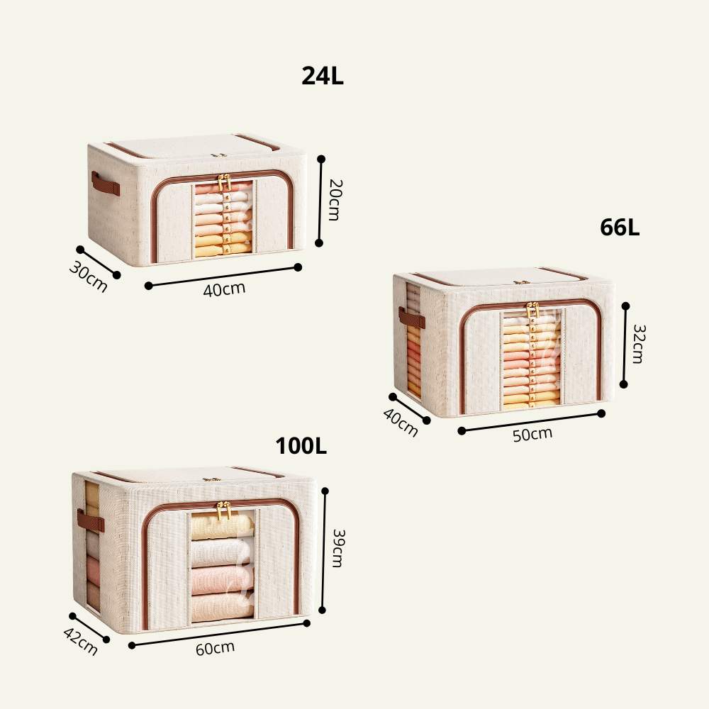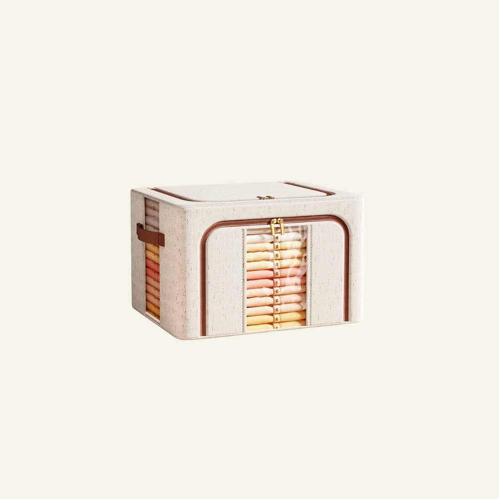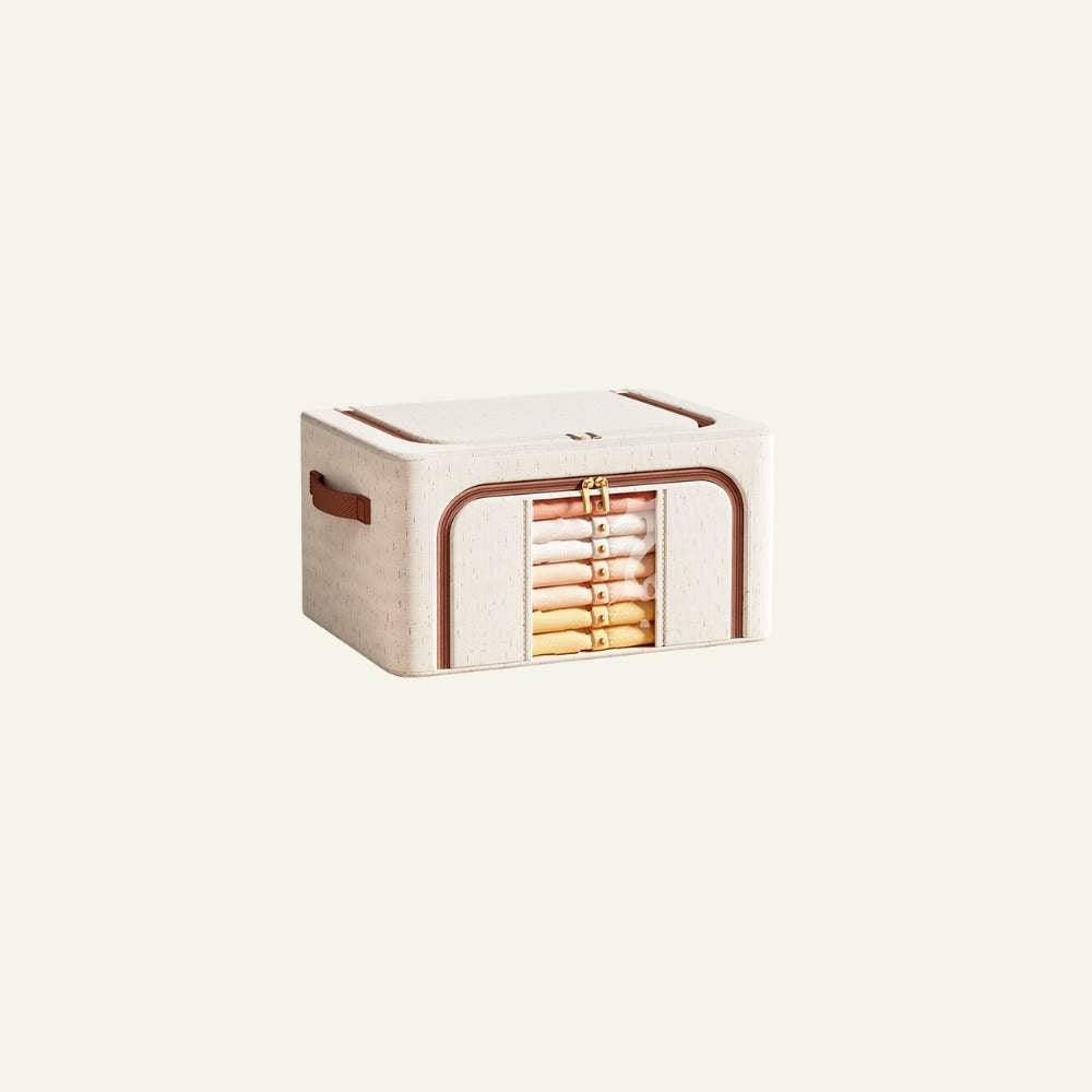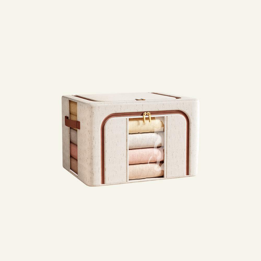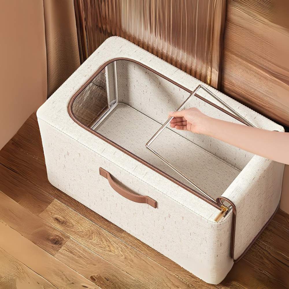 Estructura Rígida y Duradera: A diferencia de las cajas de tela comunes, este organizador está reforzado con un marco de metal interno. Esto le permite mantener su forma incluso cuando está lleno y facilita que se puedan apilar varias cajas sin que se deformen.