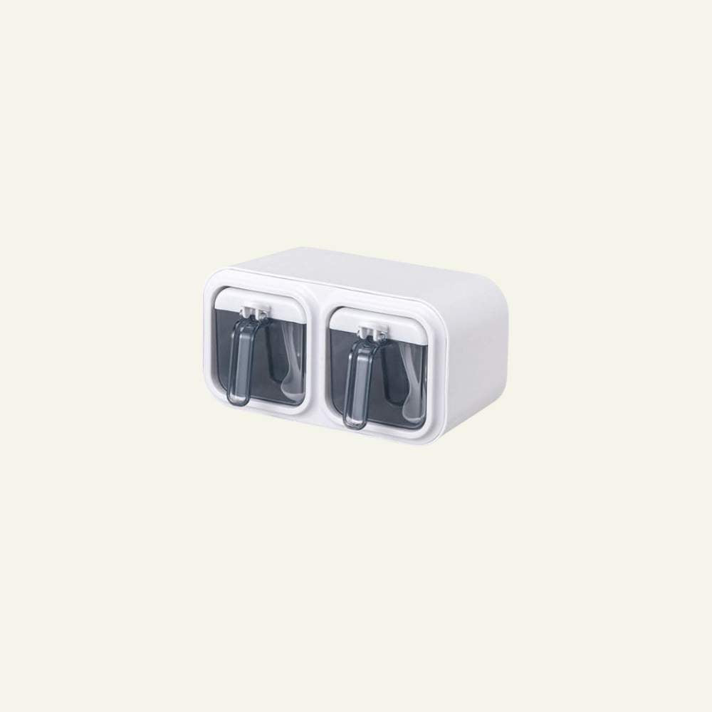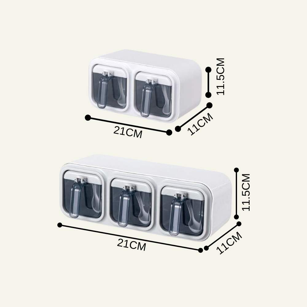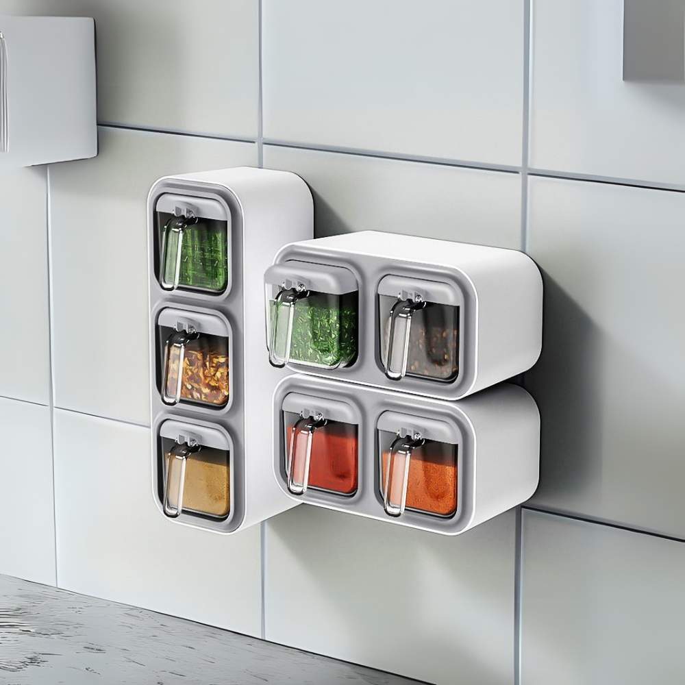 - Montaje en pared: Caja de condimentos montada en la pared con cuchara, fácil de instalar sin necesidad de perforar agujeros, manteniendo tus superficies libres de desorden.