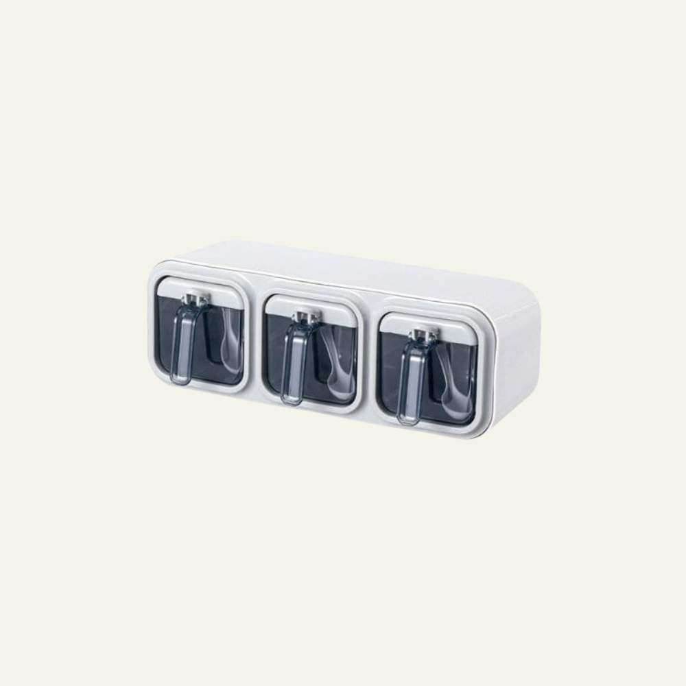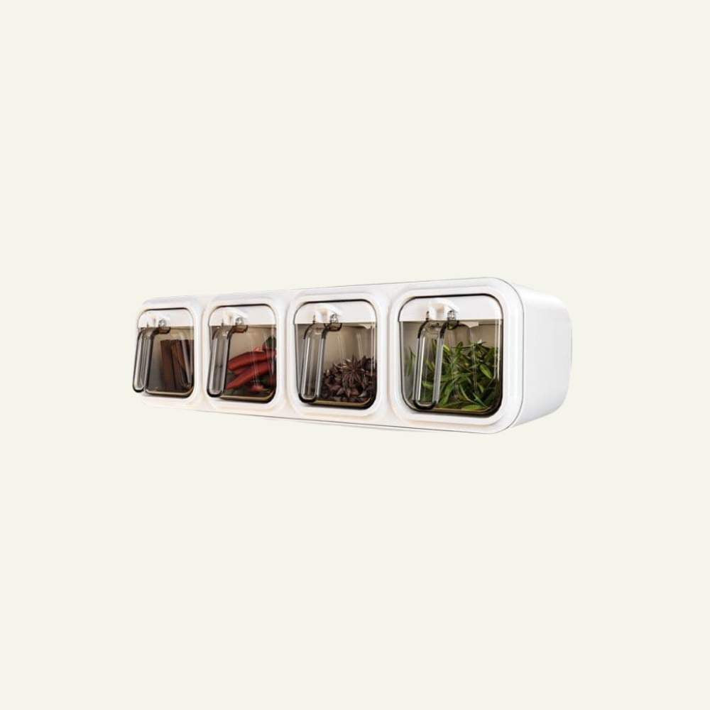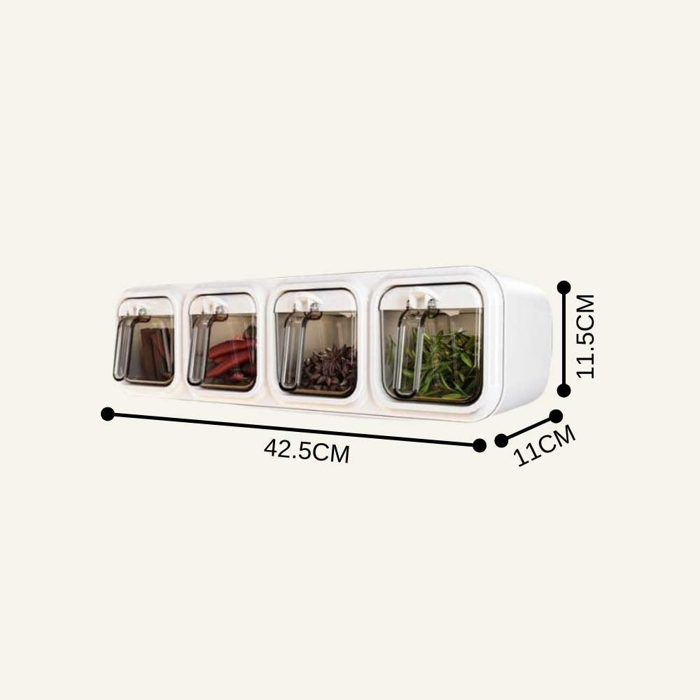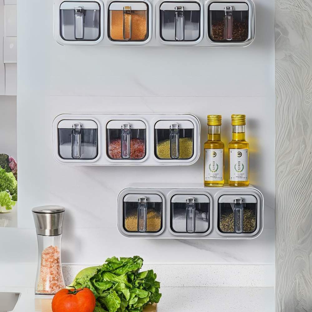 - Montaje en pared: Caja de condimentos montada en la pared con cuchara, fácil de instalar sin necesidad de perforar agujeros, manteniendo tus superficies libres de desorden.